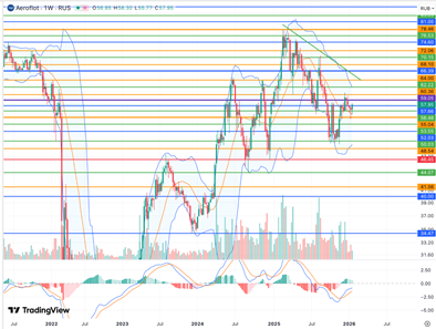 С технической точки зрения в конце 2025 года акции Аэрофлота начали восстановление от минимумов с декабря 2024 года, но в последние недели импульс к повышению ослаб. Положение выше 55-55,50 руб (нижняя полоса Боллинджера дневного графика и средняя полоса Боллинджера недельного) говорит о сохранении у бумаг базы для развития роста и движения в район 60,89 руб (максимум декабря), а далее – в район 62,20 руб (верхняя полоса Боллинджера недельного графика), но в целом силы покупателей уменьшились. Отсутствие геополитического оптимизма может вернуть котировки ниже 55 руб и увеличить риски движения к минимуму прошлого года 49,64 руб. При улучшении геополитической обстановки надежды инвесторов могут быть сконцентрированы в том числе на увеличении зарубежных маршрутов Аэрофлота с более высокой средней стоимостью билетов.