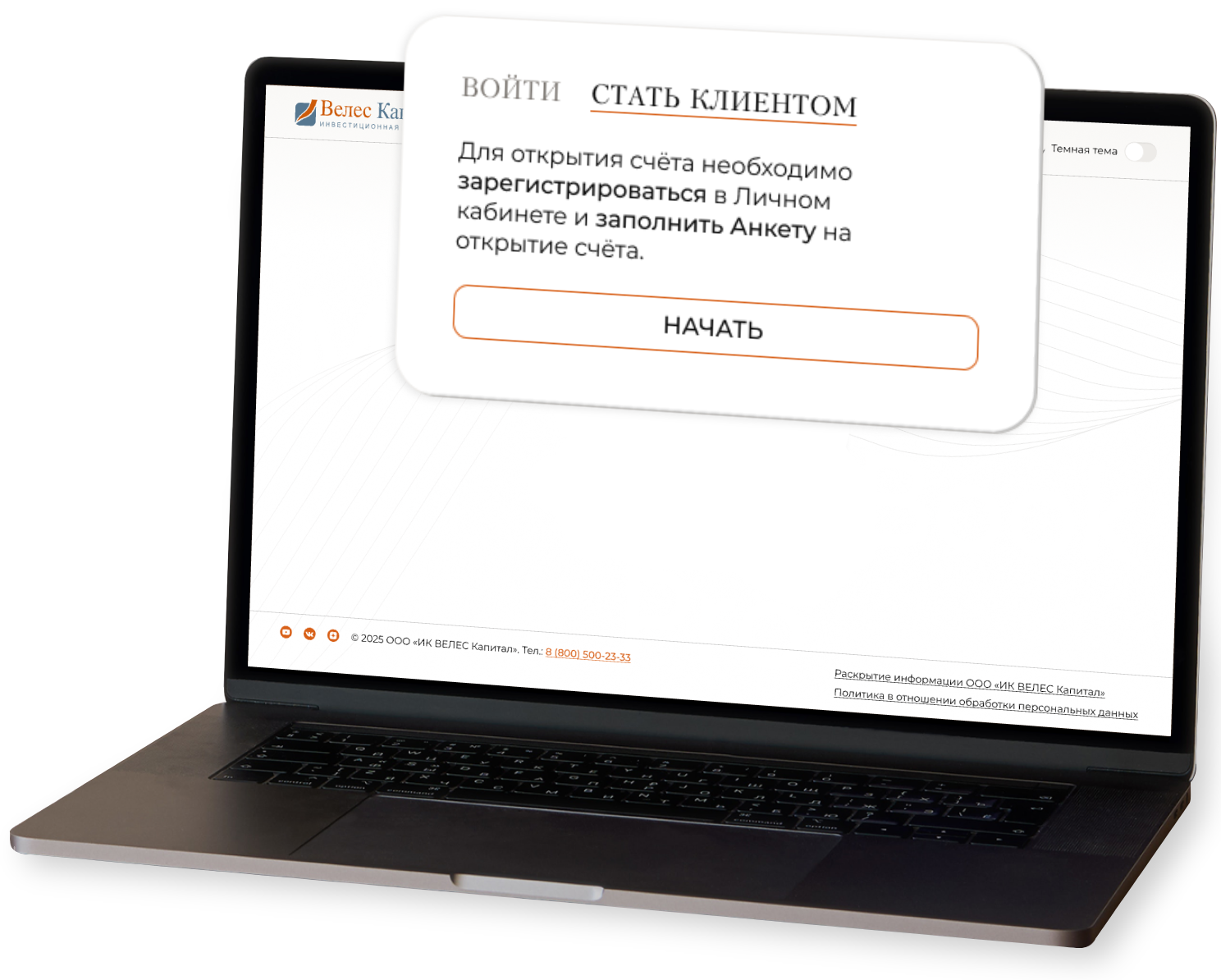 - Откройте брокерский счет в ООО «ИК ВЕЛЕС Капитал» онлайн самостоятельно;